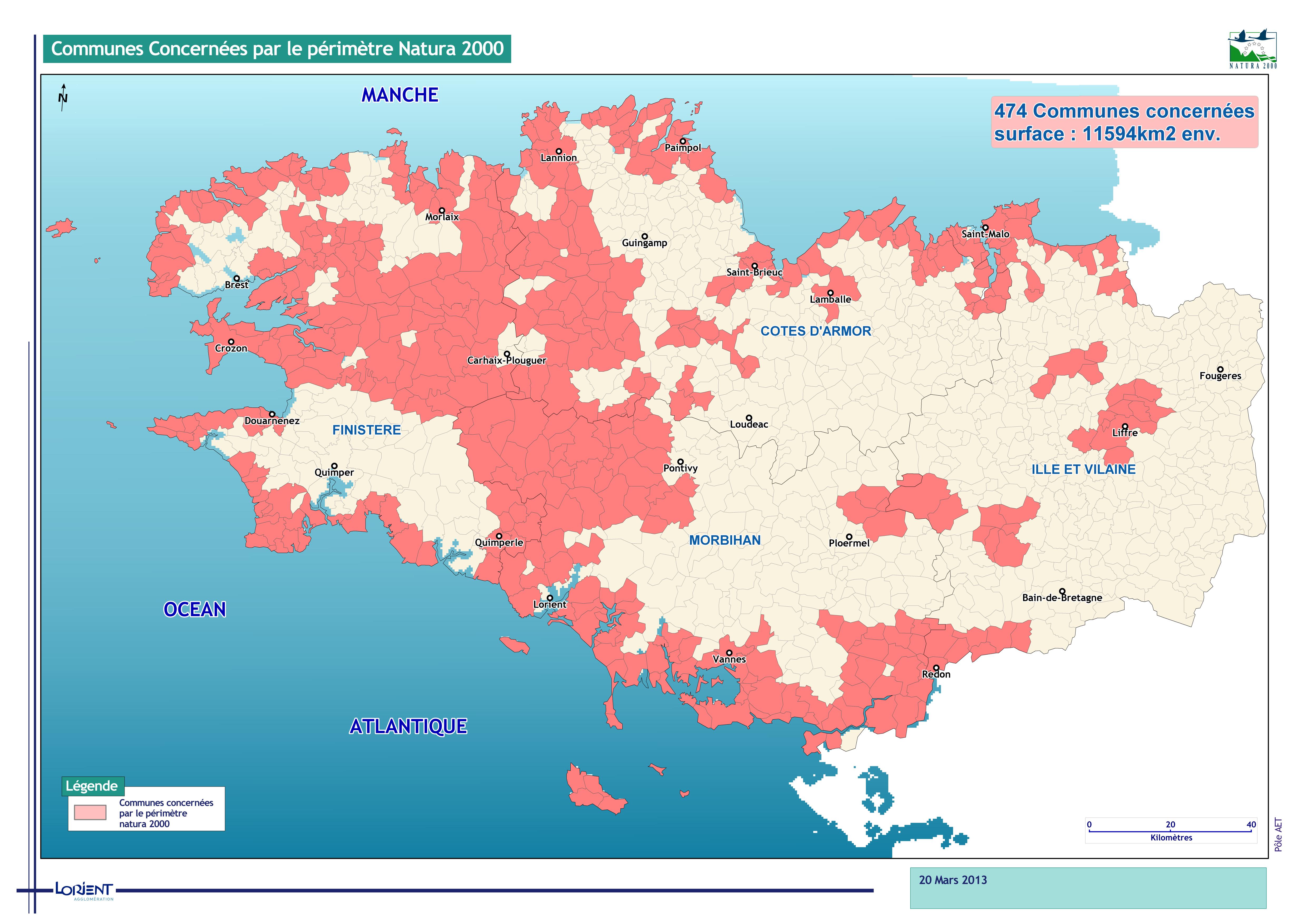 474 communes sont concernées par Natura 2000 en Bretagne pour une surface de 11 594 km 2 , soit 42 % du territoire Breton (27475 km2).